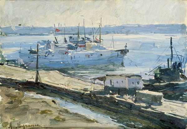 Editor: John Park's "Snow in the Harbour of St Ives" is such a textural painting! I'm drawn to the visible brushstrokes and how they capture the damp chill of the scene. What compositional elements stand out to you? Curator: Observe how Park employs a high horizon line, compressing the sky and focusing our attention on the harbor itself. The repetition of vertical masts creates a rhythmic structure, punctuated by the horizontal lines of the buildings. What effect does this interplay of lines produce, in your opinion? Editor: I think it creates a sense of stillness, despite the implied activity of the harbor. Curator: Precisely. The limited palette further reinforces this mood. Notice how the muted tones of grey, brown, and white contribute to the overall feeling of quietude and restraint. The subtle variations within these hues create depth and visual interest. Editor: I see what you mean. It's less about the literal depiction of snow and more about the formal arrangement of shapes and colors. Thanks! Curator: Indeed. It's through this careful construction that Park evokes a powerful sense of place and atmosphere.
