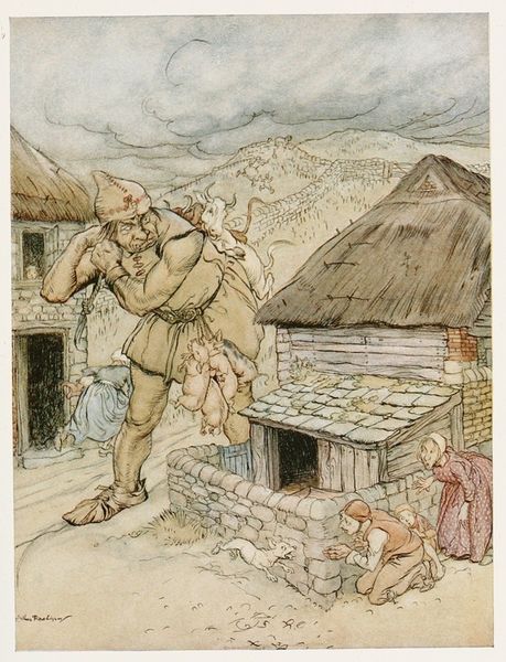 Arthur Rackham created this image, *The fisherman and his wife had no children, and they were just longing for a baby*, with pen and ink and watercolor. It looks like he enjoyed the process of making, letting the lines find their way, and allowing the delicate washes of color to set the mood. Looking closely, you can see how Rackham uses texture to tell the story. The scrawling, almost frantic lines of the fisherman's net contrast with the smooth, flowing lines of his wife's dress. It’s like the tension between their desires and their reality is drawn right there on the page. Notice the way the ink lines dance across the surface, creating a sense of movement and vitality. The lines have a kind of nervous energy. And those muted colors – they give the whole scene a dreamy, otherworldly feel. This piece reminds me of other illustrators like Aubrey Beardsley, who also used intricate lines to create a sense of mystery. But where Beardsley is all about decadent fantasy, Rackham brings a folksy, almost fairytale-like quality to his work. Both artists remind us that art is a conversation.