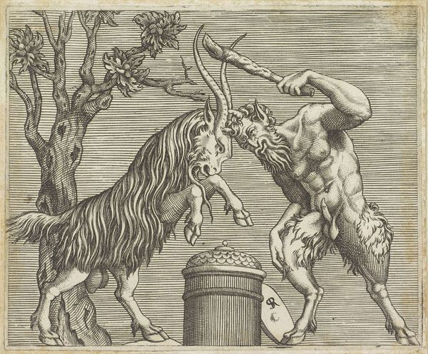Editor: This is "A satyr and a ram attacking each other," an engraving by Marco Dente dating from between 1510 and 1532. I'm struck by the dynamism of the composition. The figures are so muscular and the action feels really intense. What do you see when you look at this print? Curator: Immediately, the formal tension between the two figures captures my attention. The satyr's aggressive posture and the ram's equally fierce response create a visual push-and-pull, which is further accentuated by the architectural elements acting as a stage for this struggle. Observe how the lines define the musculature – there's a real play between light and shadow that adds depth. Editor: Yes, I noticed that too. The lines are so precise and detailed. How do the classical elements fit into this rather violent scene? Curator: Indeed, the use of classical architectural elements—the column, the building in the background—juxtaposes with the chaotic violence of the figures. These serene elements provide a structural stability which intensifies our viewing of the more savage confrontation between the satyr and ram. Notice also the careful arrangement of the background elements—a play of geometrical form against the organic shape of the animals. Editor: That's a really interesting way to look at it. It makes me consider the balance that exists, not just in the literal arrangement, but also in the contrast of the subjects. Curator: Exactly. The beauty of this piece lies not just in its technical execution but in its carefully structured relationships. A semiotic reading of the ram, the satyr, their aggression, and the classical buildings provides us with interesting insight. It is an image constructed on tension. Editor: Thank you for sharing this insightful perspective. I now appreciate how the composition elevates the work from merely depicting a conflict into a more complex statement. Curator: Indeed. Attending closely to such structural relationships yields rewarding aesthetic results!
