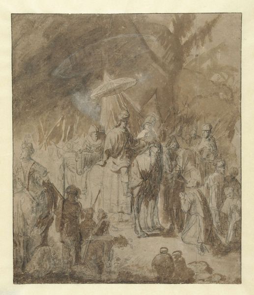 Elias van Nijmegen created this artwork with pen in gray ink and gray wash. Notice how the composition pulls us into a scene of profound drama and respect. The gray washes create a somber mood, enhancing the scene’s gravity, while the precise pen lines define the figures, adding depth to the emotional narrative. Alexander the Great is shown covering the body of Darius. The artist draws our attention to the interplay between conqueror and conquered, life and death, honor and defeat. Van Nijmegen uses a muted palette to emphasize the themes of mortality and moral complexity. The arrangement of figures, set against a loosely sketched backdrop, directs our gaze, using contrast to elevate the central figures. This formal decision invites a deeper interpretation of how power dynamics can be subverted by acts of empathy and respect. The artwork prompts us to consider how gestures of humanity can redefine the legacies of historical figures.