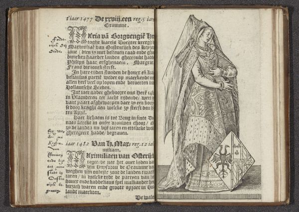 This engraving of Jacoba van Beieren was made around 1600 by Hendrick Goltzius. It appears within a book, across from a block of text describing her life. Jacoba was a powerful and controversial figure in the 15th-century Netherlands. As Countess of Holland, Zeeland and Hainaut, she faced constant political struggles and betrayals, including imprisonment. Goltzius's image reflects the visual codes of power and nobility in the Dutch Republic. She is dressed in regal robes trimmed with fur, and wears an elaborate headdress. The coat of arms at the bottom is a visual signifier of lineage and authority. The Dutch Golden Age was characterized by a burgeoning print culture. Engravings such as this served to disseminate historical narratives and shape public perceptions of figures like Jacoba van Beieren. By studying these images alongside texts and other historical sources, we can gain insight into the complex interplay of art, politics, and social memory.