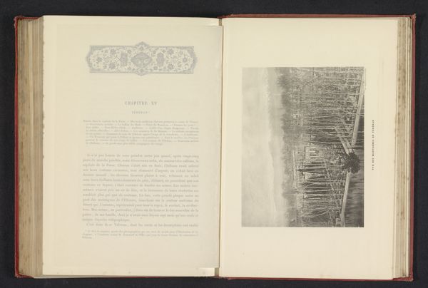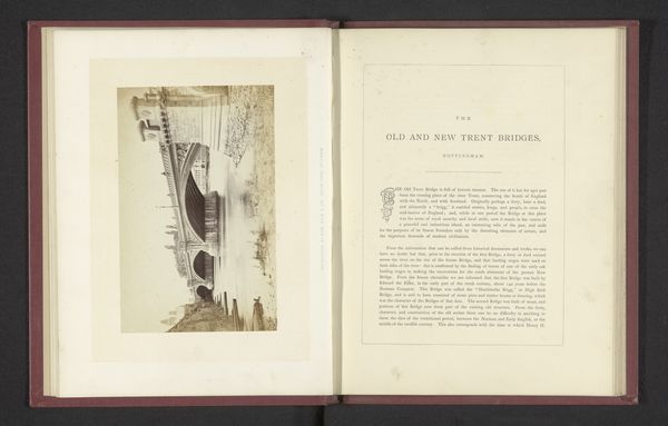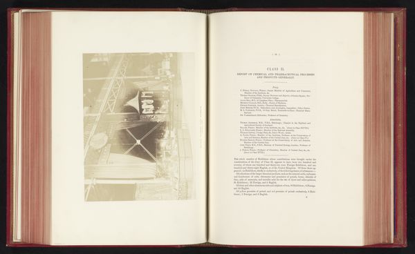 Curator: Looking at this sepia print laid bare on an open book, I feel like I’ve uncovered an antique. It looks quite fragile. Editor: That’s an interesting impression. This is a photographic print from 1851, meticulously crafted by C.M. Ferrier and F. von Martens. The piece documents a rather grand display at the Great Exhibition held in London. It's titled "Presentatie van plantaardige producten uit Schotland op de Great Exhibition of the Works of Industry of All Nations in 1851 in het Crystal Palace in Londen". Curator: Such a lengthy title! Ignoring the botanical presentation implied, I'm immediately drawn to the structural elements captured. The light, crisscrossing steel almost abstracts the scene, but somehow monumentalizes industrial advancement through geometry and tone. Editor: Absolutely. The image exists as part of a broader social, economic, and cultural moment. This exhibition was a platform for empire, showcasing resources plundered across the world, cloaked in the guise of industry and progress. It makes me wonder about the human cost behind all that botanical abundance displayed at the exhibition. Curator: From a formal perspective, look how the artists balanced detail against the diffuse light. See how our gaze is cleverly redirected by the criss-cross design towards the photograph's implied vanishing point. We’re drawn into the scene. The choice of a print laid out across a bound book only strengthens this formal observation. The art becomes referential not to life but instead to art itself. Editor: And yet, its status as a reproduced image, positioned within a book about the exhibition, gives us reason to pause. What isn’t the picture telling us about laborers and colonial enterprise? The formal beauty, yes, but it's inseparable from the structures that made this abundance possible. Curator: Fair enough. Considering your point about the cultural framing, perhaps that formal redirection you were so intent on a moment ago served to intentionally sanitize, or conceal, what you felt were atrocities behind its creation. It seems that light can often distort what actually is, in order to achieve what it seems. Editor: Indeed. Thinking about its place within this book now only reinforces its purpose of celebrating the wealth, and eliding questions about its origins and future impacts. The past captured, neatly archived for prosperity. Curator: In conclusion, examining both formal design and context gives one much to ponder with Ferrier's and von Martens' study.