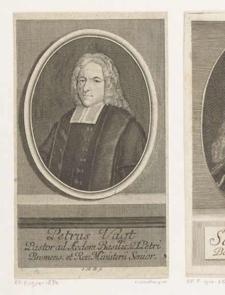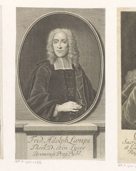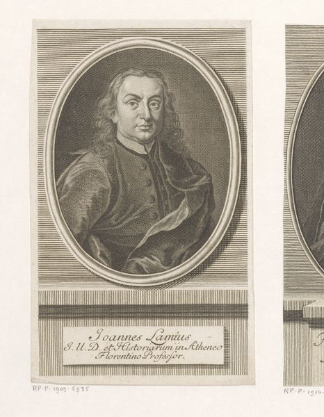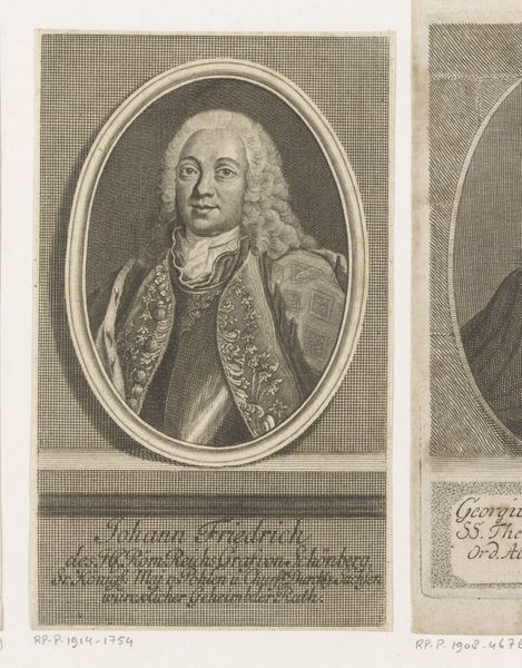 Martin Bernigeroth created this portrait of Georg Friedrich Schröer, now at the Rijksmuseum, using etching techniques to render an image that feels both formal and intimate. The oval frame, a structured shape, immediately focuses our attention on the subject's face. Bernigeroth's use of line is particularly striking; he employs fine, closely-spaced lines to build up the darker tones of the coat, contrasting with the coarser, more open lines that define the background. The artist’s strategic deployment of line directs our gaze, encouraging us to consider Schröer's expression and the textures of his garments. This attention to detail invites us to consider the materiality of the etching itself, a network of lines creating an illusion of depth and form on a flat surface. The semiotic weight of portraiture, especially in this era, lies in its ability to convey status and character. Bernigeroth's technical skill, combined with the symbolic language inherent in portraiture, makes this print a compelling object of study. It reminds us that images are constructed, not merely reflections of reality, and invite ongoing questioning.