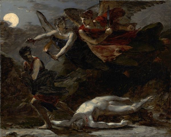 Editor: This painting is called "Cain Fleeing after the Murder of Abel" by Giovanni Battista Langetti, from the 17th century, and it's an oil on canvas. The scene feels incredibly turbulent and dark, the figures are rendered with a kind of raw intensity. What strikes you most about its visual composition? Curator: Immediately, the stark contrast between light and shadow, a hallmark of Baroque painting, compels the eye. Note how Langetti uses tenebrism not merely to illuminate the figures of Cain and Abel but to delineate the emotional weight of the narrative. The fleeing Cain is dynamically positioned, his body a series of diagonals that clash with the static horizontal of Abel's corpse. How might we understand this contrast as a visual encoding of guilt and innocence? Editor: So, it's less about the story itself and more about how the artist uses light and form to communicate that story’s emotional core? Curator: Precisely. Observe also the brushwork. It’s loose, almost violent, especially in the rendering of the landscape. This textured surface is not simply representational; it’s expressive. Langetti manipulates the materiality of the oil paint to evoke the turmoil within Cain and the devastation of the act he has committed. Consider how this emphasis on texture impacts the overall meaning. Editor: I see what you mean, it is interesting that Langetti focused on texture and dynamic composition to emphasize drama. I assumed history paintings were illustrative, focused on accuracy above all else. Curator: Not exclusively. Here, the figures themselves almost become secondary to the dramatic interplay of light, shadow, and texture. It prompts a semiotic reading—a system of signs—where artistic devices communicate affect. Editor: This was very enlightening! I now realize that visual analysis can allow us to "decode" the raw emotion within a painting through understanding light, composition, and texture. Curator: Indeed. It reveals the intrinsic qualities that elevates a piece to something that affects the soul.
