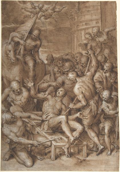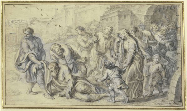 Editor: Here we have an oil painting entitled "Gemeine Jeuchts Beeldt. Allegory of the Temptations of Youth," created sometime between 1598 and 1610. It's currently housed at the SMK in Copenhagen, and the artist is, sadly, unknown. There’s something…chaotic about it. A tussle of bodies and emotions. What's your initial take? Curator: Chaotic is a brilliant way to put it. Imagine stumbling into a rather… boisterous party thrown by your conscience. This painting screams 'Mannerism' – all that elongated drama, a real visual feast designed to both entice and morally instruct, which, let’s be honest, is a tough balancing act! The artist grapples with the age-old battle between virtue and vice. See how the central figure is pulled between worldly pleasures and a more disciplined path? Editor: I see the armored figure now, almost pulling him away, towards… what exactly? And who are all these other figures? Curator: Precisely! The figure in armour likely embodies virtue or reason. It’s a guiding force, urging towards self-control and perhaps salvation, symbolized by the architecture in the distance. And around our… shall we say, ‘struggling’ protagonist are embodiments of youthful temptations: wine, revelry, carnal pleasures. Notice the subtle yet potent expressions, each figure tugging him further into either ecstasy or damnation? Almost like watching your bad decisions unfold in real time, aren't they? Editor: It’s incredibly…busy. So many conflicting pulls, so much detail. It makes the whole thing feel overwhelming, much like temptation itself, I suppose. Curator: And that’s exactly the point! It's designed to spark self-reflection, forcing one to contemplate our choices, asking: who guides our hand when we're faced with temptation? Are we destined to be dragged down, or is there strength in reason? Did anything particularly resonate with you about how this moral crossroads plays out in this canvas? Editor: Definitely how… messy it all is. Good and bad aren't neat categories; they are tangled, which feels honest. I’ll definitely be chewing on this one for a while! Curator: Absolutely. A beautiful, complicated, rather crowded mirror reflecting our inner lives, and really makes you think, doesn’t it? A true testament to human inner conflict and morality, even 400 years on!