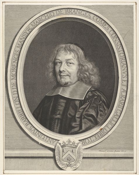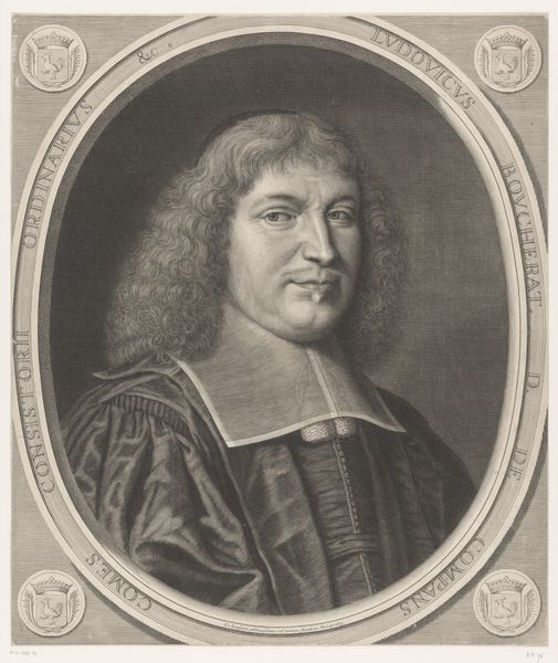 Curator: Before us we have Robert Nanteuil’s portrait of François Guénault, crafted between 1659 and 1669. The artwork resides here at the Metropolitan Museum of Art and showcases Nanteuil's skill in printmaking. It is both an etching and an engraving. Editor: My initial reaction is one of subtle power. The way the light catches Guénault's face within that oval frame almost feels like a captured moment, poised between intimacy and officialdom. You see the meticulous etching creates a depth I wouldn't immediately expect. Curator: Absolutely. The image really is about layers both literal and figurative, what does it mean that this portrait uses the methods of reproduction typically afforded to pattern books for clothing designs, books of ornament, how-to manuals? Does its status shift? The image must have been made accessible through such print technologies. Editor: That’s very perceptive. Considering that he was the first physician to the Queen, the symbols become incredibly telling, doesn't it? Even in the curve of his wig, there's a symbolic language being spoken— one of status, profession, but perhaps also inner character. Is he trustworthy? He’s presented as reliable, which can carry significant weight given the era's medical landscape. Curator: Indeed. Nanteuil’s choice of printmaking democratized his image. A hand-drawn portrait would limit visibility to a select few, mostly the subject’s close acquaintance and powerful associates. The question for us is what about portraiture lends itself to being reappropriated for use in printed format. Editor: And I think the printmaking technique is itself a message, underscoring precision, intellect and method. It makes me consider: What cultural narratives does it reinforce or perhaps subtly challenge given what you mentioned. The choice of medium does shape our perception. Curator: I completely agree. Exploring those narratives allows a richer experience of works of art. Editor: Absolutely! I find I look at it differently now knowing that process, thank you for enlightening me!