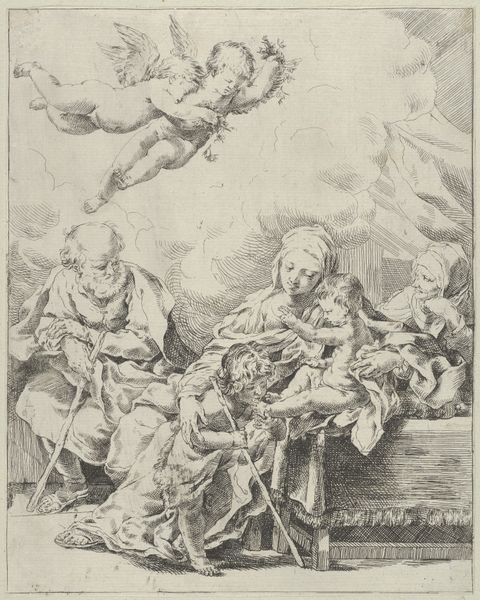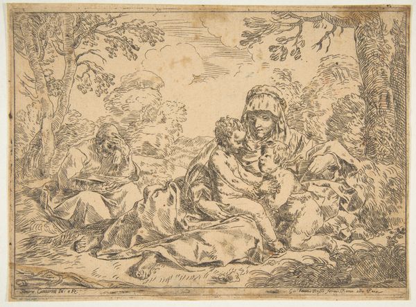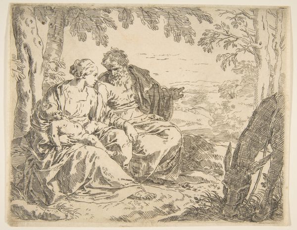 Simone Cantarini created this etching, "The Holy Family Resting on Their Flight into Egypt," now at the Metropolitan Museum of Art. A dominant use of line defines the scene, creating a texture that's both detailed and delicate. Note how Cantarini uses the density and direction of the lines to model forms and create shadow. This technique infuses the scene with a sense of depth. The composition, grouping figures closely together in the foreground, draws our eye to the intimate moment of rest during their journey. The angel plucking dates from the palm tree both protects them and provides sustenance. Cantarini uses the formal structure to convey deeper meanings. The lines create a visual framework that invites contemplation of themes like divine protection and the human experience of the Holy Family. The very materiality of the etching, with its stark contrast of light and shadow, serves to highlight the spiritual weight of the scene.