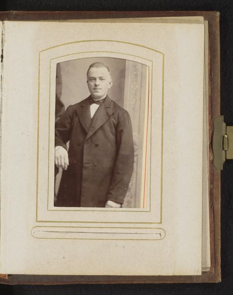 This is a photograph, ‘Portret van een man met baard,’ made by Symonds & Co. The photographic print is housed in a decorative card mount, a common presentation format in the late 19th and early 20th centuries. Photography democratized portraiture, offering a relatively inexpensive alternative to painting for the middle classes. Studios like Symonds & Co. employed skilled technicians to operate cameras, develop prints, and retouch negatives. The final product, often mounted and framed, mimicked the look and feel of traditional painted portraits, thus bridging the gap between industrial production and fine art. The photograph’s surface, once glossy, now bears the marks of time, reflecting the inherent fragility of the medium. The mount, with its embossed details, speaks to the era’s aspirations for accessible elegance. Mass production techniques allowed studios to create these affordable keepsakes, capturing likenesses and preserving memories for a growing consumer culture. This image reminds us that even seemingly straightforward portraits are products of complex social and economic forces, intertwining art, craft, and the rise of industrial capitalism.