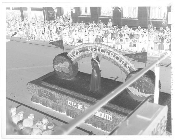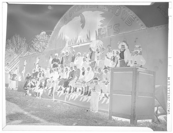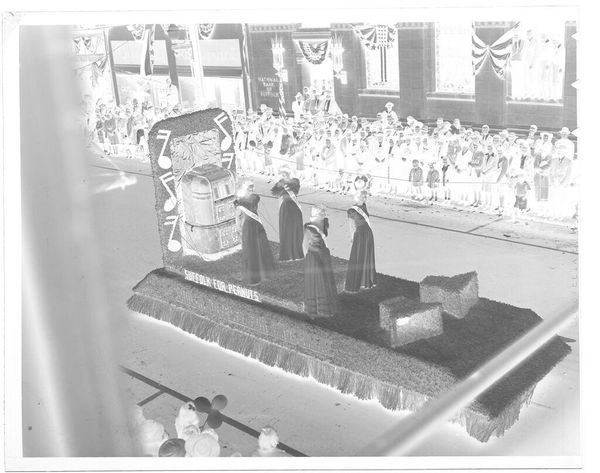 Editor: This silver gelatin print, "Untitled (float in parade)" by Hamblin Studio, presents a rather distorted view of a parade float. The negative image makes it a bit eerie. What strikes you most about its composition? Curator: The inverted tonality certainly disrupts conventional viewing. We might consider the formal relationships between the dense crowd and the figures on the float, noting how the light and shadow play to flatten the image, creating a sense of unease through visual dissonance. Editor: So, the unsettling feeling comes from how the light and dark are reversed? Curator: Precisely. It forces us to analyze the image's structure and the stark contrast, rather than immediately interpreting the subject matter. The materiality of the photographic print itself becomes central. Editor: I never thought of it that way; it's more about the image's qualities than what it shows! Curator: Yes. The photograph becomes an exercise in decoding visual information and its internal relationships.