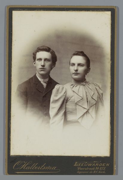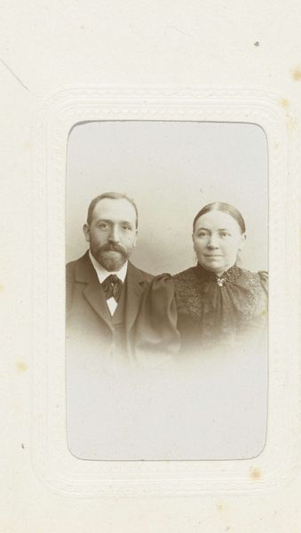 This is an undated portrait of a woman and a man with a pince-nez by Max Büttinghausen, held at the Rijksmuseum. The subdued palette draws immediate attention, dominated by sepia tones and softened contrasts, typical of early photographic processes. Light gently models the subjects' faces, emphasizing their features with a delicate touch. Compositionally, the figures are arranged symmetrically, filling the frame to convey a sense of formality and balance, reflecting the conventions of portraiture at the time. The absence of vibrant color encourages us to focus on form and structure; the subtle interplay of light and shadow reveals the texture of clothing and the nuances of expression. This reductive approach to color invites a semiotic reading, prompting questions about representation and reality. How does the photographic medium shape our understanding of identity, and what symbolic meanings are embedded within the frame's formal constraints? The photograph transcends mere representation by subtly challenging our perceptions and expectations of the genre.
