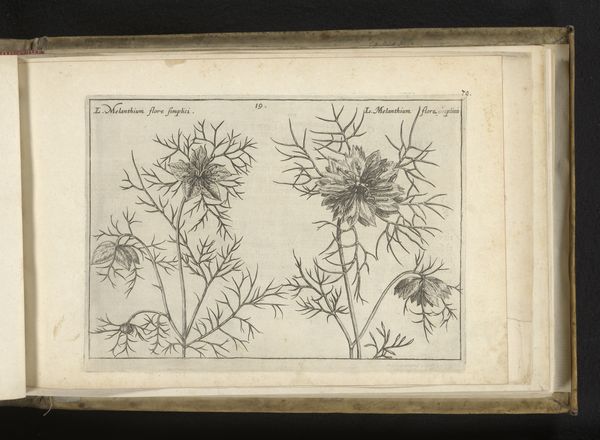 Curator: We're looking at a drawing entitled "Details van een plant en bijbehorende bloemen," which translates to "Details of a plant and associated flowers," created anonymously sometime between 1650 and 1676. It resides here at the Rijksmuseum. Editor: The immediate feeling I get is one of serene observation. The monochromatic rendering casts an almost ghostly aura around these botanical specimens, wouldn't you say? Curator: Absolutely. The artist’s deliberate arrangement, and moreover the balanced distribution of dark and light tones across the page, emphasizes the baroque period's fascination with capturing forms. It’s all articulated in ink on paper. Editor: It speaks volumes to their ability to capture, not just likeness, but character. Flowers often stand for fragility and ephemerality, so the decision to record them with such precision… does that signify something about 17th-century mortality anxieties, perhaps? Curator: Quite possibly, or at least a desire to capture the world for scientific and artistic purposes. The stark contrast evokes Chiaroscuro. Notice how this accentuation defines the volumetric properties of each flower, from the closed buds to the unfurled petals. It’s a study in texture and light. Editor: Each choice of botanical illustration also feels significant. I see anemones which can be tied to desertion. What of that drooping bloom near the bottom, symbolizing grief and mourning? The whole feels steeped in veiled melancholy. Curator: That interpretation resonates, especially when coupled with the detailed yet sparse rendering. Observe too, how the artist uses varied line weights to distinguish foreground from background elements. And the delicate rendering evokes delicacy within each subject. Editor: I'm struck by how our interpretations complement each other; that visual tension perhaps reflects that ever-present duality in life and even art itself. Curator: Indeed. Whether it is for allegorical symbolism or close-observation analysis, these qualities enrich the work.