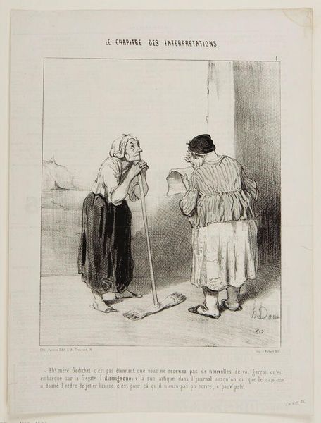 Curator: This is Paul Gavarni's print, "Misery and her Children," from the Harvard Art Museums. The monochromatic palette and etched lines immediately convey a sense of grim hardship. Editor: It certainly does, and it speaks volumes about the socio-economic conditions of the era. Look at the clothing, or lack thereof; it highlights issues of class and material disparity. Curator: Gavarni, born in 1804, was known for depicting Parisian life. His lithographs provide insight into the lives of ordinary people, exposing the means of subsistence. Editor: Absolutely. It's a visual record of poverty, bringing awareness to the plight of the marginalized, and perhaps even a call to action through social commentary. Curator: Considering the labor involved in printmaking at the time, the production itself underscores the value placed on representing these social realities. Editor: Indeed. The material object becomes a vehicle for empathy, demanding we acknowledge these realities and challenge systems of oppression that perpetuate them. Curator: A powerful image; it offers a poignant view of both artistic process and social concern. Editor: It compels us to consider who suffers, and to ask what roles we can play to address it.