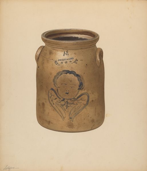 Curator: Elsie Wein's watercolor and colored pencil drawing, "Jar," created between 1935 and 1942, presents a straightforward depiction of utilitarian pottery. I'm particularly struck by the detailed rendering of a seemingly ordinary object. Editor: Yes, it’s interesting how she elevates something so functional to the level of art. It seems… nostalgic, perhaps? The drawing captures all the details like the Albany slip glaze and the cobalt decoration. What draws your eye to it? Curator: For me, it's about the layering of representation. We have a drawing of a ceramic jar, which itself is a product of labor and material processes—clay sourced, formed, fired, decorated. Wein is documenting a craft, almost acting as an archivist of material culture. Think of the conditions that impacted ceramic production during the depression, as a contrast to more classically prized artwork, then ask: where do we position craft? Editor: So it's less about the jar itself, and more about what the jar represents in terms of labor and production? Curator: Precisely. The drawing becomes a record, not just of the object, but of a particular moment in the history of its production and consumption. Is it about idealizing this rural "thing", and should we unpack that idealisation if so? Or is it simply about Wein’s labouring process, that she too worked for an end product? Editor: I hadn’t thought about it that way. It definitely shifts my understanding from simple appreciation to thinking about broader cultural implications. I wonder what this jar would have held or represented in its own time. Curator: Absolutely. It's a jumping-off point. How does Wein’s rendering connect with the lived experiences tied to these material objects? Editor: Right, considering the social context and material conditions gives the artwork a much deeper meaning. Curator: Exactly! Looking at art from this angle lets us investigate larger questions about value, labor, and cultural memory, I found the exploration fruitful. Editor: Me too! This gives me a completely fresh angle when thinking about still life, and how the value of it all shifts.