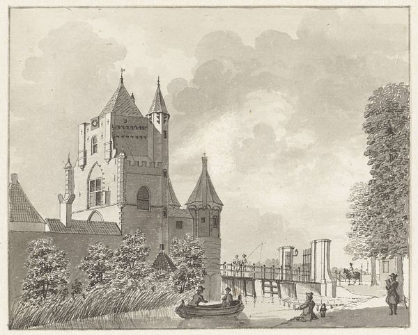 Editor: This is a print from between 1860 and 1885, entitled 'Fotoreproductie van Löwenburg bij Willemshöhe' by Jm. v. Ph. Frey. It depicts a cityscape with what seems to be Löwenburg castle nestled within the landscape, and is striking in its commitment to Romantic landscape. What symbols jump out at you in this piece? Curator: Immediately, I see the very deliberate juxtaposition of nature and man-made structure. The wild, untamed landscape, so characteristic of Romanticism, cradles the constructed castle and smaller monuments on the hills. How do you interpret the figures in the foreground? Editor: They seem quite small, almost inconsequential in relation to the architecture, like players in a stage set. Curator: Exactly. This echoes the Romantic notion of the sublime—the humbling power of nature—with human presence feeling rather fleeting. And what of the castle itself? Do its features communicate anything? Editor: It feels idealized. Almost like a romanticized vision of the past. Curator: Yes. Castles evoke a powerful connection to history, to stories of nobility, and valor. In this image, that idealized past seems to blend seamlessly into the natural world, as if these historical narratives are inherently woven into the very fabric of the landscape. How does this romantic view of the past serve cultural memory? Editor: I suppose it makes the past seem grander, perhaps obscuring more difficult truths with this focus on picturesque scenery and noble structures. Thank you, I'm noticing more depth to the image after considering the symbolism. Curator: Indeed, visual symbols shape our understanding. And by engaging with those symbols, we unlock deeper meanings and connect with a collective, if idealized, past. I learned something, too.