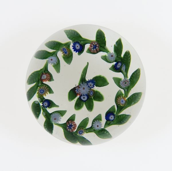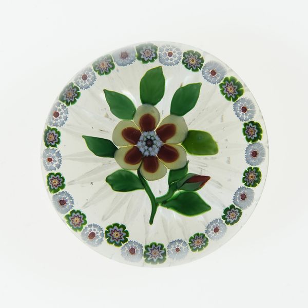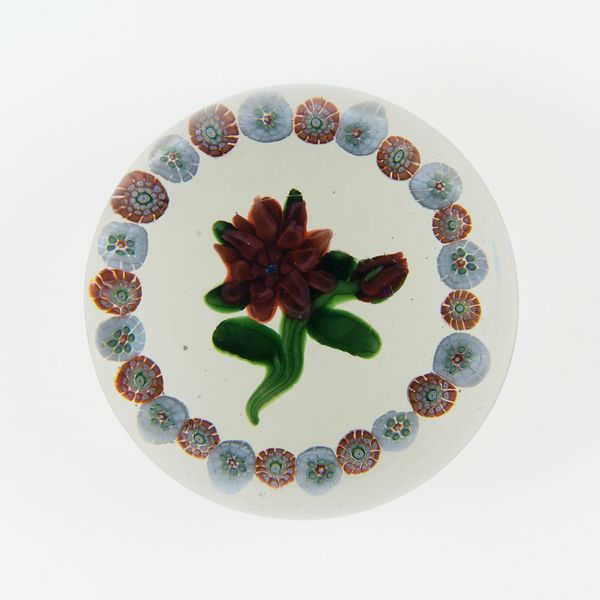 Curator: Let’s discuss this fascinating paperweight created by Baccarat Glassworks, sometime between 1845 and 1860. You can find it here at the Art Institute of Chicago. Editor: It’s exquisite! The clarity of the glass, the encased floral design… it gives a feeling of stillness, doesn't it? Like a preserved moment in a secret garden. Curator: Indeed. During this era, paperweights weren't mere desk accessories; they reflected the burgeoning middle class’s desire for beauty and status through collecting decorative arts. Their presence spoke of leisure and refined taste. Editor: I'm captivated by how the artist uses color and form. The central blue dahlia is encircled by delicate, multicolored florets. It’s a mesmerizing exercise in circular composition. Note how it creates an echoing, fractal effect. Curator: Consider also that Baccarat, among other glass factories, strategically aimed their production at wealthy patrons and royal families throughout Europe, crafting not just objects of utility, but also trophies of industry and luxury. Editor: You know, looking at the precision, the controlled bubbles within the glass... It demonstrates remarkable skill and material understanding, wouldn't you agree? I'd be very curious about their exact production processes. Curator: Glass production at Baccarat was a carefully guarded secret, relying on skilled labor often passed down through generations. Also the popularity of these glass paperweights mirrors trends in botany and collecting that gripped much of the nineteenth century, making items like these fashionable objects among women in particular. Editor: Interesting...It strikes me now—the symbolism might extend beyond mere decoration. Flowers can represent so many things; remembrance, beauty, and also the fleeting nature of life, captured forever inside the unyielding glass. Curator: I find that so plausible! Thanks, by understanding its history and material worth, as well as decoding some visual cues, this small object certainly grants us insight into its contemporary moment. Editor: Yes, precisely! Seeing it like this definitely highlights just how art invites this intersection of sensory experience and intellectual analysis.