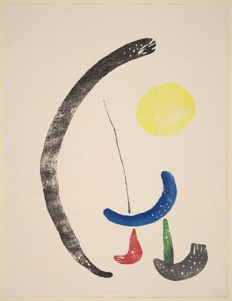 Editor: So this is Joan Miró's "Untitled [plate XLIV]" from 1958, created using mixed media printmaking. The sparse composition is intriguing, and the forms feel very gestural and free. How do you interpret this work through a formal lens? Curator: We can appreciate the composition's careful balance. Observe the dominance of the large black, calligraphic form offset by the smaller, vibrant colors scattered around it. How does this contrast of scale and tone affect your perception of the picture plane? Editor: I guess it directs the eye upwards, from that heavier, almost grounded shape, toward the airier, more playful elements. The colors definitely feel like they're floating. Curator: Precisely. And consider the negative space – the expanse of white surrounding the shapes. It's not merely a backdrop but an active element, contributing to the overall sense of openness and the lightness of being. This considered use of emptiness intensifies our focus on the isolated shapes. Do you agree that the material quality, the texture inherent in the print, plays a role? Editor: Yes, definitely. You can see the slight imperfections and the way the ink sits on the page. It adds to the sense of spontaneity. I hadn't considered how much the negative space contributed to that feeling though. Thanks! Curator: Indeed, Miró's mastery lies in achieving such impactful expressiveness with seemingly minimal means. A profound lesson on the power of restraint and deliberate composition.