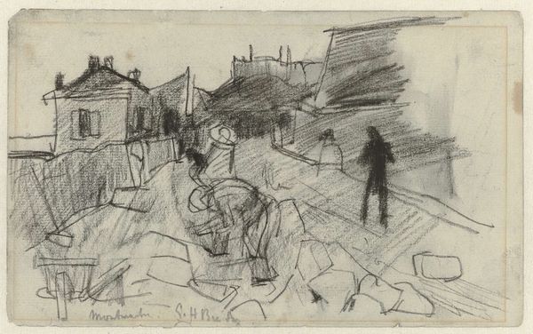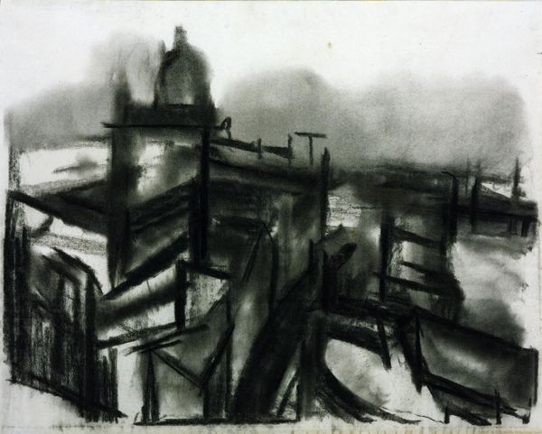 Curator: David Bomberg, born in 1890, created this piece titled "The City on the Rock, Evening, Ronda, Spain". It's part of the Tate Collection and rendered on a support of 470 by 628 millimeters. Editor: It looks almost oppressive, like the city is a geological formation bearing down. The heavy use of charcoal adds to that weight. Curator: Bomberg was deeply interested in the city as a symbol of modern life. He explored these urban spaces, and this piece encapsulates his interpretations. Editor: It’s all about process, the layering of charcoal, the marks he chose to leave visible. Look how the charcoal dust creates atmosphere—it makes you feel the grit of the city. Curator: The lack of specific date complicates its placement within his oeuvre, but it provides a lens through which to examine his broader social commentary. Editor: Exactly, it makes you wonder about the availability of his materials, the type of charcoal used, and how it would have impacted the work. Curator: This piece invites us to contemplate the convergence of urban development and natural formations within the historical context of Bomberg's artistic career. Editor: It makes you think about the labor, both artistic and manual, involved in creating and sustaining a city like Ronda. Curator: It provides a rich tapestry of historical, social, and artistic considerations. Editor: A raw, honest portrayal of place through the labor of art-making.