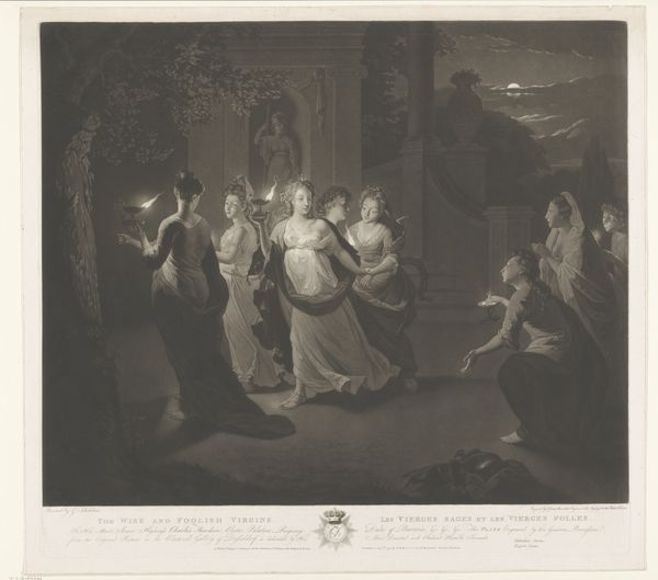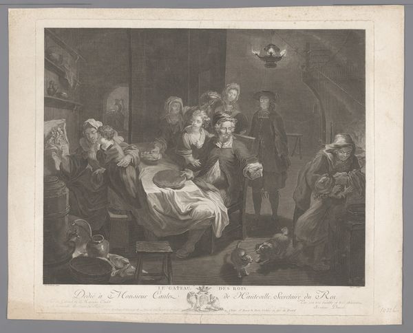Curator: The stark emotion practically leaps off this print, doesn't it? Editor: It’s positively heart-wrenching. What are we looking at? A scene of profound grief? Curator: Exactly. This is "Laatste samenzijn van Lodewijk XVI en zijn familie," or "Last Reunion of Louis XVI and his Family." It’s an engraving from 1794, created by Luigi Schiavonetti. We are so lucky to see it at the Rijksmuseum. Editor: It does have that historical novel sort of weight to it. And a terrible claustrophobia. Everyone's crowded together but terribly isolated in their despair. How do you find a tender moment in something so political, if that makes sense? Curator: That tension, that attempt at tenderness within historical inevitability, is precisely where I think its power lies. It's propaganda, of course, intended to stir royalist sentiments, but it's also incredibly vulnerable. You can see the attempts at neoclassical dignity, even serenity, in the figures' poses, but their anguish cracks through. Look at Marie Antoinette’s wild, despairing gestures, versus the carefully balanced composition of the whole scene. Editor: Yes, even in what should be a balanced domestic scene, everything seems askew. It really feels like everyone is teetering, about to fall. Even the priest to the left feels sort of shifty. This might sound crazy, but it reminds me of an early silent film still; exaggerated poses, a kind of desperate stagecraft. Curator: What you see in it relates back to the history of its creation. Remember that images like this were explicitly designed to tug at heartstrings. That very artificiality, that “stagecraft” as you call it, is a conscious choice meant to elicit a powerful emotional response from the viewer. The pen work allows for dramatic tonal contrast; and by the careful arrangement of each family member, Schiavonetti created maximum drama. Editor: A tragic opera in monochrome! Still, to witness something so deliberately manufactured, yet conveying real despondency, it creates this peculiar feeling, like an echo of something profoundly upsetting. A sense of genuine humanity bleeding through the calculation, wouldn't you say? Curator: I would, absolutely. It's that friction between intention and outcome that continues to draw me back to this image. It leaves me considering not just what happened, but also how we are *supposed* to feel about it. Editor: Definitely a moment to ponder. It’s always about more than meets the eye isn’t it? Thanks for walking me through that!