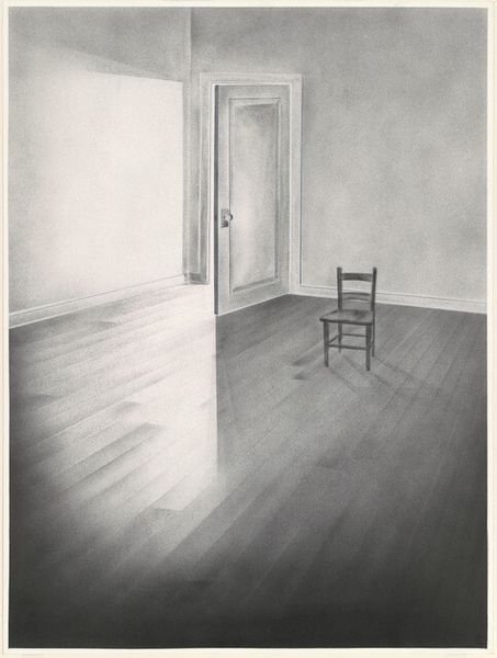 Curator: Well, this pencil drawing from 1975 by Ed McGowin certainly has an interesting atmosphere. A room corner, a window... there's something almost ghostly about it. Editor: Ghostly is the word. The muted tones create a real sense of quiet, a sort of domestic unease. The surface is paper, but that texture just looks like the sort of material, a domestic quietude just on the verge of discomfort. I find it hard to believe he used pencil! I would’ve placed my bets on watercolor! Curator: It speaks to McGowin's mastery of the medium, doesn't it? Consider how a simple pencil on paper creates such depth and light. It also really calls attention to the artist's labor, all those minute pencil strokes adding up to the bigger picture. We should really contextualize this within art production practices, especially at a time when labor in artmaking was itself a subject for critical scrutiny. Editor: That's a great point. Looking at this through the lens of labor brings a whole new dimension. Beyond technique, there’s an almost melancholic feeling here, though. The lone window, the empty room... what does this say about interior spaces at that time, and about privacy in domestic settings? It makes me think of how the social role of the house changed, especially after 1968, when there were big cultural shifts regarding the role of public and private places. The shadow is pretty sinister. Curator: Precisely. Shadows have always served as metaphors, even within interior design, where placement became a social tool, particularly with windows such as the ones shown in McGowin's artwork. We need to also think of the market for drawing – drawings frequently became stepping stones towards the development of larger paintings or even sculpture, and for drawing in itself to become collectible involved shifting the art world itself. Editor: So much to consider with such a seemingly simple image. It is a useful reminder that how artwork such as these are conceived, produced, circulated and commercialized affects our impression of the material composition within. I think that many in our audience will hopefully start noticing this from now on, and with more works as well. Curator: It also underscores the complex dance between the artwork, the artist, and the cultural environment that shapes how the art piece gets shown. Food for thought for sure.