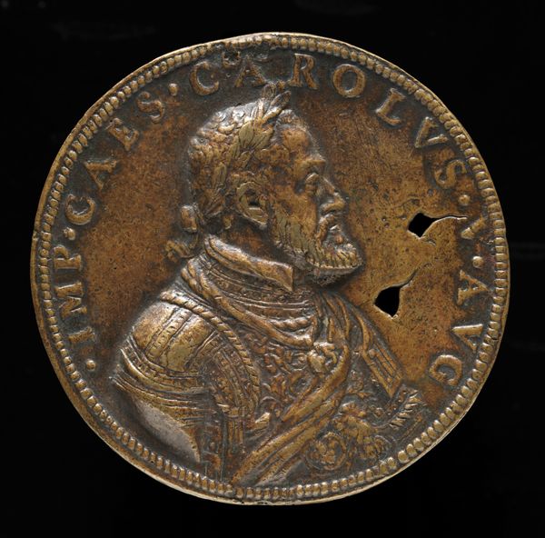 Editor: Here we have a bronze medal from 1559 by Giovanni Antonio de' Rossi depicting Pope Pius IV. It’s quite striking how the light plays on the raised surfaces, creating such depth and texture for what is, essentially, a flat object. What jumps out at you when you look at this piece? Curator: The immediate focus is drawn to the relief, meticulously executed to articulate the figure of Pius IV. Note the composition: the strong profile, framed by the circular form, the incised inscription, ‘PIUS IIII PONT OPT MAX AN I’. The details aren't just representational; they're structural. Editor: Structural in what way? Curator: Observe the textured beard juxtaposed against the smooth cranial dome. The artist used different engraving techniques to convey these textures, but more than this, observe that this deliberate contrasting is replicated in his heavily ornamented cope. These are all choices of organization that lend importance to the subject. Consider the interplay of lines, forms, and surfaces. Do these choices point to something? Editor: The formal contrasts definitely create a sense of... grandeur, maybe? By playing with textures and intricate details in the vestments against the plain background, it highlights his status and the importance of his role. It's more than just a portrait; it's a statement. Curator: Precisely. The material, the technique, and the arrangement all serve to convey meaning. It speaks to a powerful presence rendered through formal means. The very object communicates power. Editor: It’s interesting how simply looking at those elements reveals so much. I’ll definitely be looking at artworks in a whole new light now. Curator: The beauty lies in decoding how these formal elements intertwine to construct meaning.