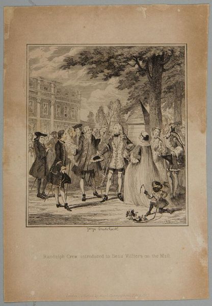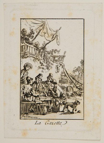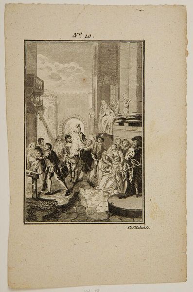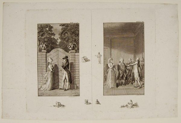 Curator: This engraving, by Augustin de Saint-Aubin, captures the poignant moment when Don Quixote embraces Sancho Panza before he departs for the Island of Barataria. Editor: It’s a bittersweet image, isn't it? There's such formality to the setting, yet the embrace itself feels so tender and full of unspoken emotion. I wonder what's going through their minds? Curator: Well, the work itself would've been achieved through careful layering of etched lines, translating a complex narrative into a reproducible image for wider distribution. Think about the economics of printmaking at the time. Editor: Right. And seeing it now, I’m struck by the artist's delicate handling of the figures. The gestures feel charged with affection, even within such a constructed social scene. Curator: Exactly. Saint-Aubin was clearly a master of capturing social dynamics, using the print medium to circulate these tales. Editor: It makes you think about how stories travel, how they’re shaped by hands and machines, and how that changes their meaning. Food for thought!
