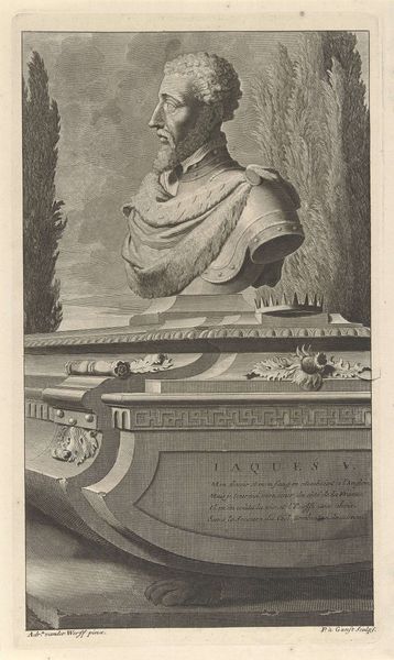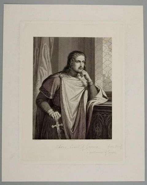 Editor: Here we have Agostino Lauro's portrait of "Otton Guglielmo, Duke of Burgundy". The detail in the etching is incredible! What does this piece suggest to you? Curator: The materials used to create this work, likely an engraving or etching process, speak volumes. The labor involved in producing such detail underscores the value placed on portraiture and historical representation. Note, also, how the Duke's attire suggests a very particular status. Editor: So, how the image was made and what he is wearing are both important? Curator: Precisely. The Duke's clothing and arms, like the buildings in the background, indicate the resources and power at his disposal. It also affects how viewers perceived him. Editor: I never thought about the labor that went into it. Thanks! Curator: Remembering the conditions under which art is made helps us understand its value beyond aesthetics.