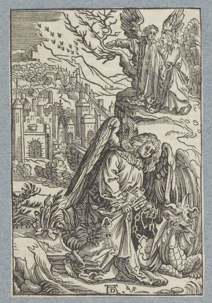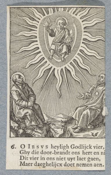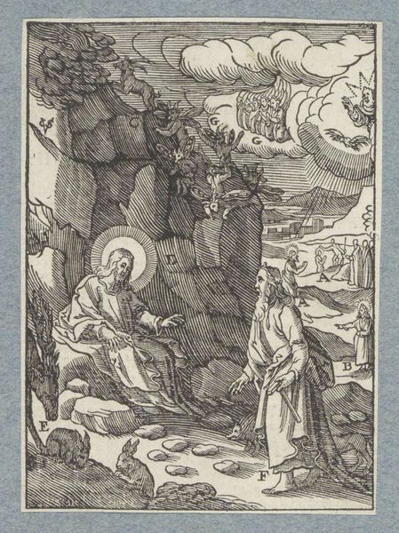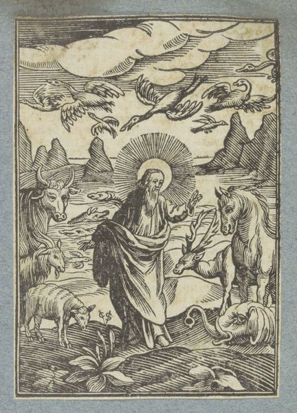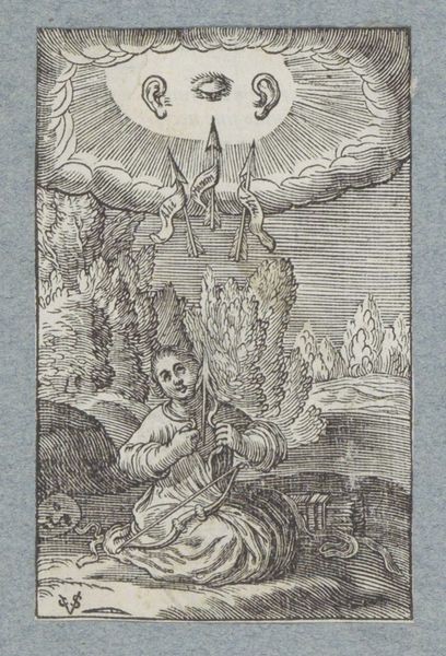 Curator: Immediately striking, isn't it? The dynamism, the energy emanating from a black and white print. Editor: Yes, quite visually compelling. This piece is titled "Vierde scheppingsdag: schepping van zon, maan en sterren," or in English, "Fourth day of Creation: the creation of sun, moon, and stars." It was crafted by Christoffel van Sichem the Younger, sometime between 1645 and 1646. We're looking at an engraving. Curator: What truly holds my gaze is the formal interplay of lines—the radiating beams behind the figure against the stark verticality of the trees and cliff face. Note also the subtle use of cross-hatching to achieve depth. This manipulation of light and shadow lends a monumental quality to what is, ultimately, a small print. Editor: And that contrast certainly emphasizes the materiality and labor involved. The engraving process itself—the physical act of carving these precise lines into a block—highlights the transition of raw materials into a consumable image, think of paper costs, labour wages in Sichem’s workshop. I wonder, too, about how prints like these circulated; they weren’t merely aesthetic objects, but vehicles for disseminating specific religious or ideological messages to the broader populace. Curator: A potent point! I see how one can read it through such a lens. Consider, further, the symbolic placement of the zodiac. A beautiful synthesis, isn't it? An amalgamation of scientific observation of the heavens blended seamlessly with theological dogma of divine creation. A sophisticated construction of order. Editor: Indeed. That’s a telling detail. Given that van Sichem was part of a family tradition of printmakers and publishers in the Protestant states, such symbolic representation might speak directly to a specific Protestant theological understanding, circulated among literate middle class urban population that might challenge traditional views on nature. Curator: So very insightful. Considering its relatively modest size, this engraving clearly contains worlds within worlds. It embodies Baroque dynamism within a rigorously defined pictorial structure, revealing sophisticated compositional techniques. Editor: I appreciate how examining the processes of artistic production enables a nuanced view of both cultural creation and dissemination, which enrich one's appreciation of an artwork, regardless of its visual qualities.