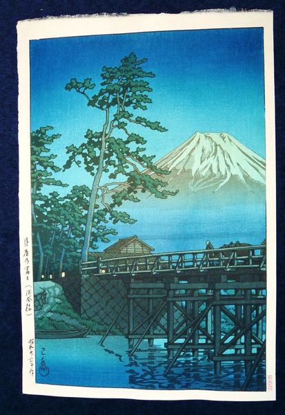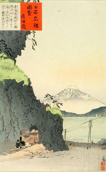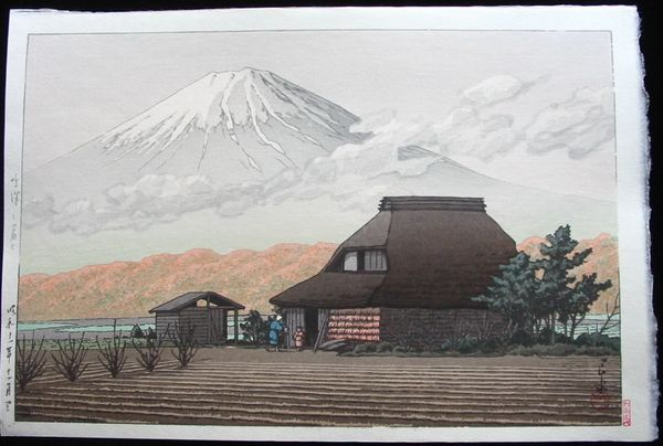 Editor: Here we have Hasui Kawase's "Evening at Tagonoura" created in 1940, utilizing woodblock print and tempera. I find the framing of Mount Fuji through the trees really striking; there’s a calmness to the composition. How would you approach an interpretation of this piece? Curator: Well, let's think about the materials and the process. Ukiyo-e prints like this were a collaborative effort. Consider the labour involved – the artist, the block carver, the printer. This wasn't just Hasui's vision; it was shaped by the skill and interpretation of other artisans. And the widespread consumption of these prints; how does that speak to its value as art versus a commodity? Editor: That’s a side I didn't really consider – I was focused on the picturesque scene. How does the process of woodblock printing itself influence our understanding of the artwork? Curator: Mass production affects how it was received and understood, even as an object representing ‘high art,’ traditionally separate from 'craft'. Does this erode its status, or enhance it by making it accessible? Also, think about tempera. Tempera often requires careful layering. How does the use of tempera to provide vivid color interplay with the nature of a print, usually based around clearly delineated woodblock areas? It brings the idea of the “aura” of art into focus - the status assigned to originals or to single works of fine art. Here, in this printmaking tradition that often makes pieces much easier to reproduce, is aura less precious? Or, might not copies themselves be elevated closer to that ‘fine art’ space through skillful craftsmanship? Editor: I see what you mean; understanding the material processes opens up completely new interpretations! The value lies in its creation and accessibility, challenging conventional notions. Curator: Precisely. Looking beyond just the image, towards the labor, materials, and means of production reveals how this print navigates the boundary between art and commodity, between singular artistic vision and collective creation. What’s your understanding of the cultural context around landscape prints being made in 1940, then? Is there perhaps an elevated sense of commodity at play for something easily replicable as opposed to landscape painting with rarer techniques? Editor: Fascinating! Now I want to go and look closer at other landscape art of the period, thinking not just about how pretty it is, but the act of making the pieces as well! Thanks!