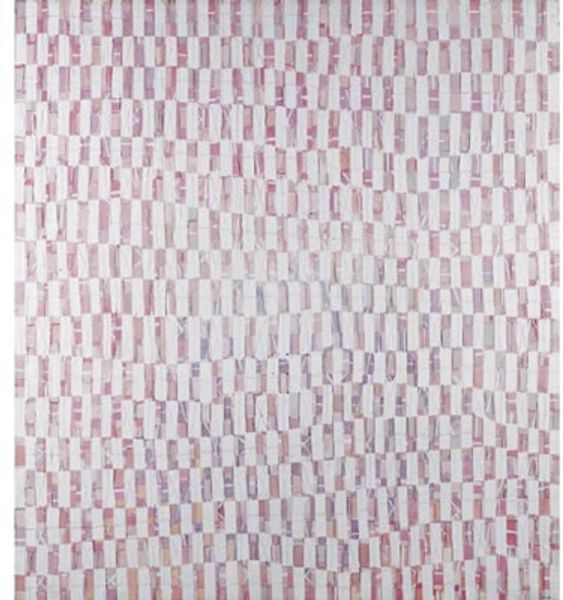 This sheet with an overall zig zag pattern was made by an anonymous artist at an unknown date. The image presents vertical lines of geometric shapes in blue against a rose background. The regularity of the pattern speaks to a culture of mass production. Textile production has historically been associated with women's work, often undervalued and unacknowledged in official art histories. Textiles had domestic and commercial uses. The anonymity of the artist raises questions about the social conditions of its creation and display. Was this design intended for clothing, household linens, or perhaps even for artistic purposes? By considering the material and purpose of this textile, we begin to understand the complex relationship between art, craft, and everyday life. Researching the history of textile production, trade routes, and design motifs will shed light on the cultural and economic context of its creation. This process underscores the role of the art historian in piecing together fragmented narratives.