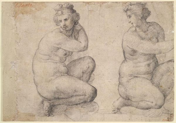 Curator: Ah, this sketch possesses a certain playful charm, wouldn't you say? Editor: Absolutely! It's got this adorable, slightly chubby innocence about it. What is this, anyway? It reminds me of my own toddler—but far less digitally enhanced. Curator: It's attributed to Willem Panneels, dating from 1628 to 1630. It’s a red and black chalk study titled, "Small boy. Three studies after an antique sculpture; left side view, front view half turned to the left, and front view." Editor: Antique sculpture, you say? Interesting. It almost feels...raw, you know? The simplicity of the lines captures a feeling of purity and even maybe a bit of self-consciousness in the figure, as if he's wondering, "Am I doing this right?" I also note the figure doesn’t have any musculature; instead, it resembles dough made of skin. It makes one want to reach out and touch this baby’s form, this toddler of antiquity. Curator: Indeed. The composition arranges three distinct perspectives of the figure, allowing for comprehensive anatomical observation. Observe the subtle variations in line weight, building depth through careful tonal modulation and delicate hatching. This piece represents not only an exercise in classical imitation but also a profound exploration of the artist’s mark-making practice, wouldn't you say? Editor: Okay, sure. Exploration and observation and mark-making...but beyond the serious artistic scrutiny, don’t you get this overwhelming sense of affection, this… warmth radiating from the paper? It’s just…pure love, immortalized. Plus, let’s be real—that tiny belly button is irresistibly cute. Curator: I appreciate your subjective reading of the piece; yet I perceive Panneels as concerned with mastering established academic methods. It illustrates more about artistic development through technical application than communicating human love. Editor: Maybe so. But, to me, technique and subject often tango; intention informs interpretation, regardless if there were children running underfoot during its making. Still, these small forms linger in your mind as more than studies in Renaissance style. Curator: I concur...ultimately, viewers engage emotionally, interpreting meanings layered deep within lines and shadows. Thank you, that was deeply engaging. Editor: Likewise, a very educational viewing indeed.