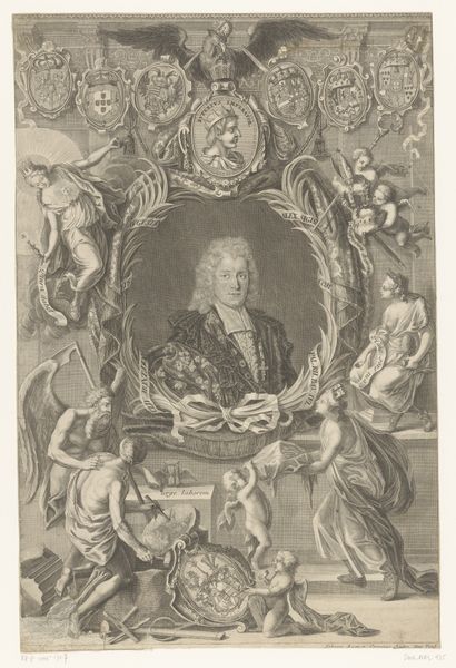L. Haas created this portrait of Friedrich I, using etching techniques. The portrait captures Friedrich in a regal posture, seated on an ornate chair against a backdrop of draped fabric emblazoned with heraldic symbols. During the time in which this portrait was made, powerful individuals, such as Friedrich, were often depicted through a lens of idealized power and authority. Clothing, pose and setting played a key role in how identities were constructed, negotiated and maintained. Friedrich’s elaborate wig, formal attire, and the symbols of power surrounding him, speak to the visual language used to convey status and legitimacy in the European courts. However, it also speaks to the emotional and personal dimensions of identity during the time it was made. In what ways can portraiture capture the multifaceted nature of identity, reflecting not just outward appearances but also inner complexities?
