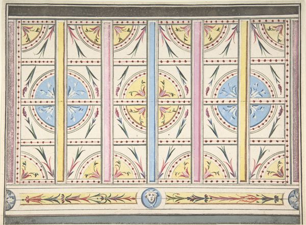 Giuseppe Bernardino Bison rendered this design for a decorated wall with ink and watercolor. Notice how the grotesque style, with its playful fusion of human, animal, and floral forms, hearkens back to ancient Roman art, particularly the decorations found in the Domus Aurea. These motifs echo through the centuries, surfacing during the Renaissance and continuing into Bison’s time. Look at the figures, reminiscent of ancient deities and mythical beings, frozen in dynamic poses. Similar figures appear in Pompeiian frescoes, or in Raphael's Vatican Loggia. The stylized garlands and geometric patterns create a sense of order and harmony, yet the grotesque figures inject a touch of wildness. This contrast mirrors the duality of human nature, our eternal struggle between reason and instinct. The image, therefore, resonates not just as decoration, but as a reflection of our collective psyche, forever caught between Apollonian order and Dionysian frenzy.