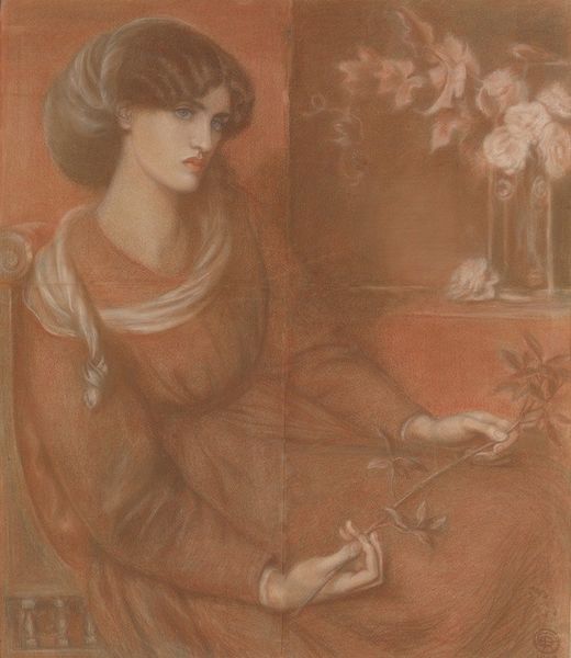 Editor: This is Joseph Edward Southall's "Cinderella", currently residing in the Tate. I’m struck by how the artist uses color and form to create a sense of wistful longing. What compositional elements stand out to you? Curator: Observe how Southall has structured the pictorial space, specifically the interplay between the figure and the surrounding garden. Note the sinuous lines of the figure’s dress, echoing the organic forms of the foliage, creating a visual harmony. How does this arrangement affect your perception? Editor: It feels very deliberate, like everything is connected and intentional. It certainly makes me notice the details more. Curator: Precisely. The artist uses minute detail, such as the embroidery on her gown, which contrasts with the broader brushstrokes of the landscape. This invites close scrutiny, rewarding the viewer's attention. Editor: I see now. The balance of detail and broader strokes creates a compelling tension. Thank you for illuminating this!