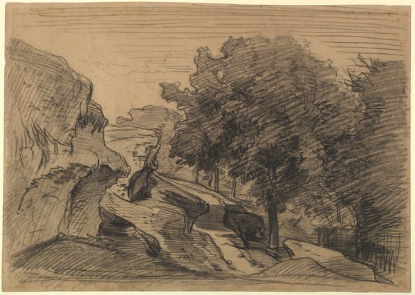 Alphonse Mandevare made this drawing of a rock formation in the early 19th century with graphite on paper. It is a study, seemingly simple and direct, but the hatching and cross-hatching create a layered effect. The artist used the qualities of graphite to his advantage; with the side of the implement for smooth shading, and the point for sharper definition. A lot of labor went into this drawing, especially when you consider that the artist had to render such a complex form with only a pencil. The artist has given much attention to the texture of the stone surface: smooth, rough, and jagged. The sharp angles and crevices of the rocks are emphasized through the way the artist builds up the light and shadow, creating a three-dimensional effect. Paying attention to the materials and processes gives us a deeper appreciation for how the artist created the artwork.
