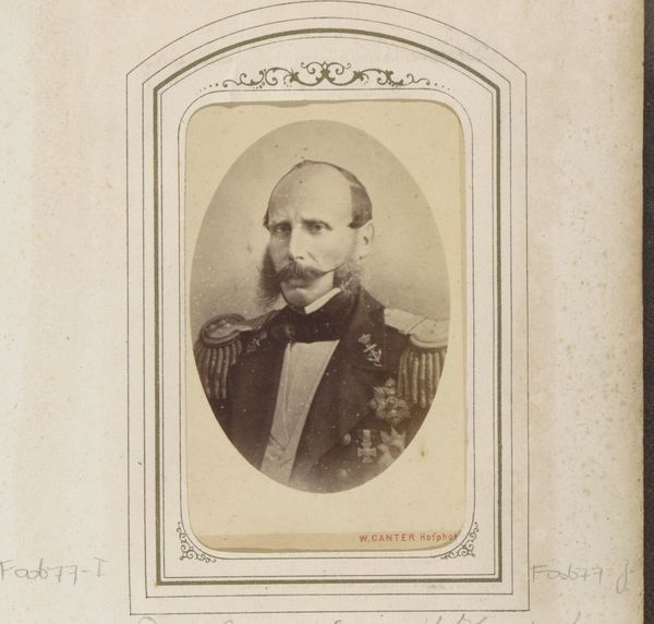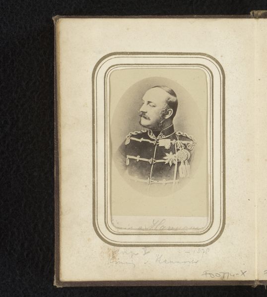 This photographic portrait of Willem II, Emperor of Germany, is presented within an album page. The photograph itself, characterized by its monochrome palette, captures the Emperor in formal attire, replete with military regalia. The composition relies on geometric shapes. The photograph is a rectangle, and the image is framed by concentric ovals, creating a sense of depth. The subject's gaze is directed forward, engaging the viewer directly, while the overall symmetry in his posture and adornments suggests authority and order. The framing of the photograph within the album evokes semiotic layers of meaning. The rigid structure of the album page contrasts with the individualistic portraiture, setting up a tension between public image and private context. This interplay complicates the reading of the portrait, moving beyond simple representation to questioning notions of identity, power, and the gaze. The work uses formalism to destabilize conventional understandings of portraiture by engaging with broader cultural and philosophical discourses.