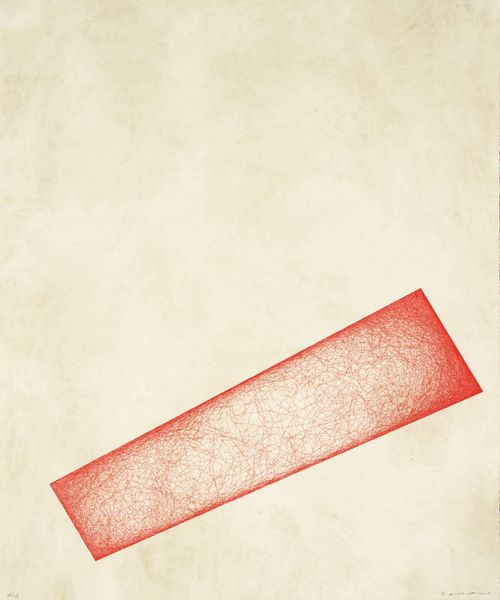 Curator: Here we have an untitled work by Yukinori Yanagi, a Japanese artist born in 1959. It's part of the Tate Collection. Editor: My first thought? It feels...off-kilter. Like a flag planted haphazardly on a blank world. Is it supposed to be unsettling? Curator: Well, Yanagi often deals with themes of national identity and authority. The red rectangle, composed of tiny lines, could represent a nation's borders, or perhaps a symbol of power. Editor: Those tiny lines… they remind me of cracks. As if the whole thing is fragile, ready to fall apart. Maybe that’s the point? The illusion of solidity? Curator: Exactly. Yanagi's work frequently critiques established structures. It invites us to question what we perceive as stable and fixed. Editor: So, it's not just a red square; it’s a commentary on the very idea of "nation" or "state," rendered in a way that highlights its inherent instability. Curator: Precisely. It’s a visually simple piece, yet it holds such complexity. Editor: I find that very powerful. Art that whispers rather than shouts often leaves the deepest impression.