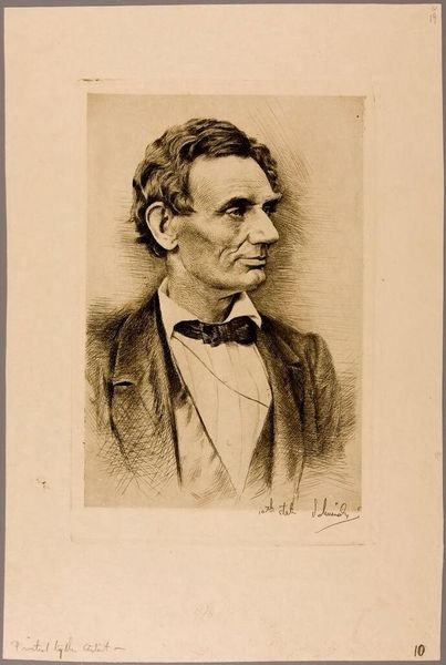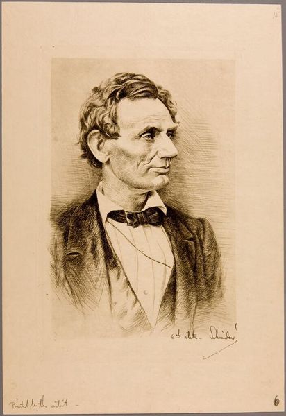 Editor: Here we have Otto Schneider's portrait of Abraham Lincoln. It's a sensitive etching, and I'm curious about how later artists chose to depict Lincoln. What do you see in this piece? Curator: It's interesting to view this portrait through the lens of power and representation. How does Schneider, working after Lincoln’s assassination, grapple with the complexities of Lincoln's legacy, especially concerning race and emancipation? Editor: That's a great point. I hadn't considered the historical context of its creation so deeply. Curator: Right, understanding the societal narrative surrounding Lincoln at the time helps us interpret Schneider's choices. The piece seems to grapple with the weight of his legacy. Editor: I see that now. Thank you! Curator: Of course! It’s these dialogues that enrich our appreciation of art.
