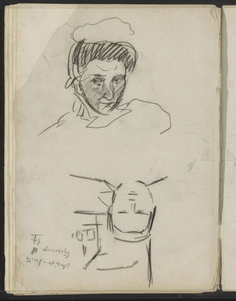 Editor: Here we have Max Beckmann's ink drawing, "drei Köpfe und Beschriftung (Three Heads, One Notation) [p. 11]". It feels like a glimpse into the artist's private world, like a quick sketch from a personal sketchbook. What do you see in this piece, something perhaps beyond its raw, unfinished quality? Curator: It's a fascinating look into the artist’s process, isn't it? Beckmann was working within the tumultuous interwar period in Germany, witnessing societal upheaval and grappling with the rise of extremism. The fragmented nature of these portraits, almost like deconstructed faces, speaks to a sense of disorientation and the breakdown of traditional societal structures. Editor: The faces do seem quite stark, almost grotesque. Do you think that's intentional? Curator: Absolutely. Expressionism, which Beckmann was a key figure of, often employed distortion and exaggeration to convey powerful emotions. In this drawing, the disjunctive elements of each face may reflect an attempt to unveil the inner psychological states of his subjects. Editor: So, it's not just about how they look, but what they represent? Curator: Precisely. Consider the implications of 'notation' in the title - what does it mean to capture a person through not only image, but inscription? What commentary can be derived when reflecting on legibility and historical erasure within society? Beckmann's portraits challenged conventional representations, pushing the boundaries of identity and exploring the anxieties of his time. Editor: It's amazing how a simple sketch can hold so much complexity! I will certainly need to learn more about the interwar context of the artist, thank you. Curator: Indeed. Art often functions as a mirror, reflecting not just the artist’s inner world, but also the social and political realities that shape their perspective.