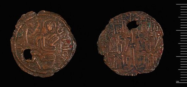 Curator: The Anonymous Follis at the Harvard Art Museums presents an interesting problem in numismatic history and its social context. The wear on the metal suggests use and exchange. Editor: I'm struck by the weathered patina and circular format; it feels like gazing at an ancient, tarnished sun. Curator: Indeed, the production of these coins allowed for a broad dissemination of religious imagery and imperial authority. Editor: The figure on one side, likely Christ, emanates a somber and powerful presence through its detailed, if worn, depiction. Curator: The material—the base metal—and the mass production speak volumes about the Byzantine economy and its need to facilitate transactions. Editor: It's remarkable how the design, even in its deteriorated state, still projects an aura of Byzantine imperial power and religious conviction. Curator: It makes me wonder about the hands it passed through, and what they could buy with it. Editor: Absolutely, and that is something beautiful to contemplate.