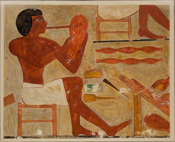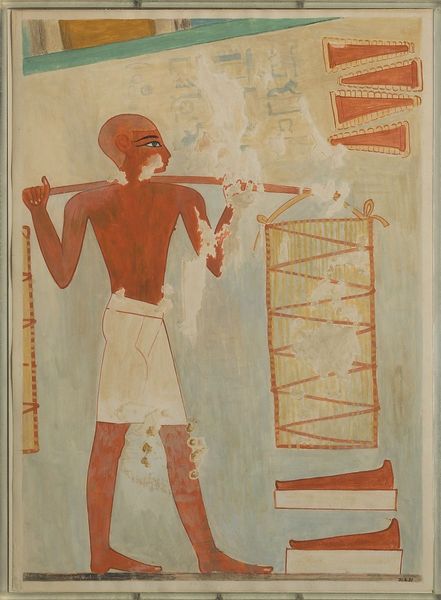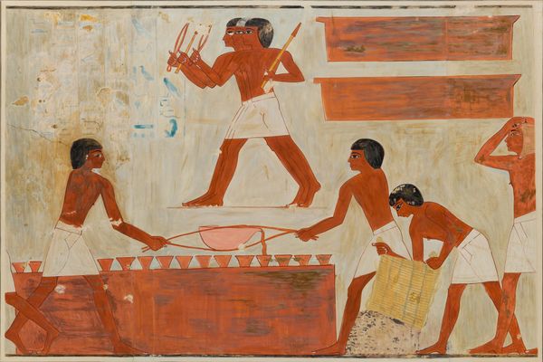 Editor: So, this watercolor painting, “Cooking Cakes with Fat, Tomb of Rekhmire” from around 1504 BC, is a copy by Nina de Garis Davies of an Egyptian tomb painting. It feels incredibly serene, even though it depicts a very active process. What do you make of its enduring appeal? Curator: It's intriguing, isn't it? The scene captures a moment of daily life, yes, but consider the symbolic weight. The cakes themselves. What did they represent to the Ancient Egyptians? Editor: Hmm, probably not just dessert. Some kind of offering, maybe? Curator: Precisely. Cakes were often used in religious ceremonies, offerings to the gods and the deceased. What is fat's association with offering, historically and anthropologically? Editor: Well, fat is energy and abundance, which makes it seem appropriate for a burial context… a way of providing for the afterlife? Curator: Indeed. Fat symbolized prosperity and life force, essential for the journey into the afterlife. Consider how the colors contribute: earth tones grounding us, the white garments representing purity. Does the process of cooking itself gain meaning when placed in this tomb context? Editor: Absolutely. It suggests nourishment, both physical and spiritual, extending beyond earthly life. The action is memory, repeated actions reflecting values that endure. I never considered how loaded everyday objects and actions can be. Curator: The Egyptians imbued everything with symbolism. Even something as simple as cooking cakes can hold profound meaning about life, death, and the afterlife. Editor: I'll definitely be looking at everyday scenes differently now. It's all about cultural memory embedded in the seemingly mundane.
