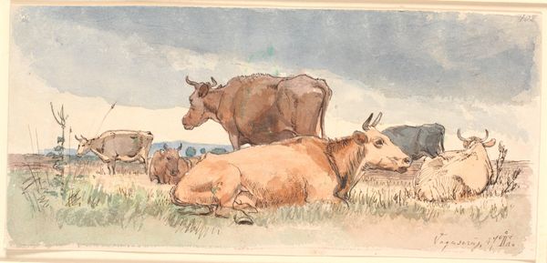 Curator: Let's take a moment to consider Ferdinand Hodler's "The Bull," painted in 1878. It offers an intriguing example of the artist’s early realism period. Editor: I like it! He seems like a gentle giant, doesn't he? But a bit lonely, off on the right side like that. Curator: The bull's isolation can be read in many ways. Consider the context of late 19th-century Switzerland. Hodler's paintings often grapple with themes of national identity and the changing roles of rural communities in an industrializing society. Editor: Ah, so maybe the bull is Switzerland, sturdy but stuck? Or is it supposed to be the changing landscape he's stuck in? Kind of melancholic, that horizon line isn't it? It doesn't go anywhere. Curator: Precisely. He seems to be drawing attention to this magnificent creature and questioning its place in the landscape. I would argue it might also allude to anxieties around masculinity at that time as society moved beyond traditional pastoral ideals. Editor: Maybe he's just cold. Looks windy on that little hill in the background. Curator: Yes, one cannot ignore the artist’s plein-air style, a notable attribute visible with its subtle layering and earthy color scheme; we get a sense of the cold wind. I think the subdued tones evoke the quiet struggles embedded in rural life and labor. Editor: It does invite quiet reflection, though, doesn’t it? Like he's thinking things through, trying to come to terms with a reality he maybe doesn't entirely love. A bit like me with my taxes! Curator: The painting encourages us to reflect not only on what the bull signifies but what it felt like to live and survive alongside nature, an experience increasingly estranged with time. Editor: Right. I bet this painting kicked off some good conversations when it came out. It definitely just kicked off one with me! I’m off to find a meadow. Thanks, Ferdinand, and thank you!