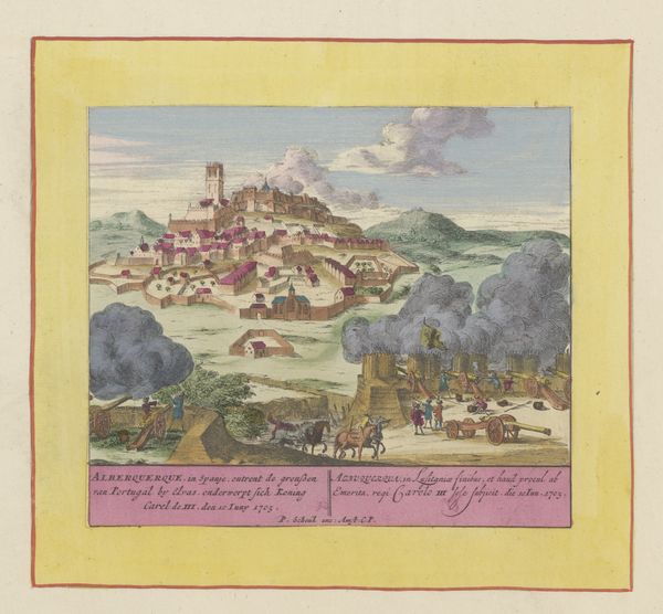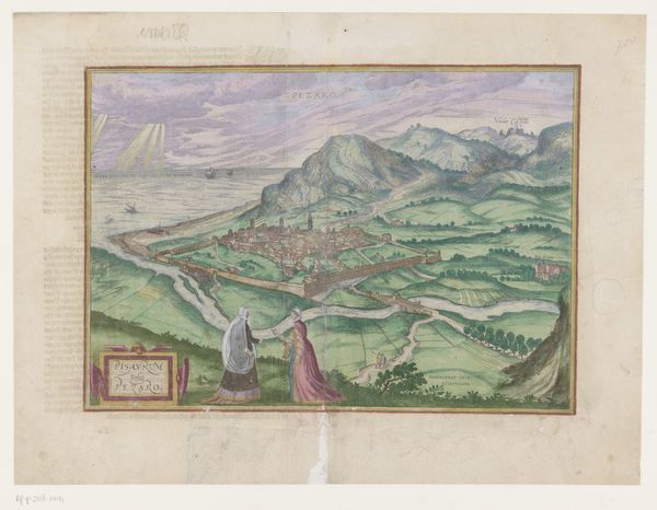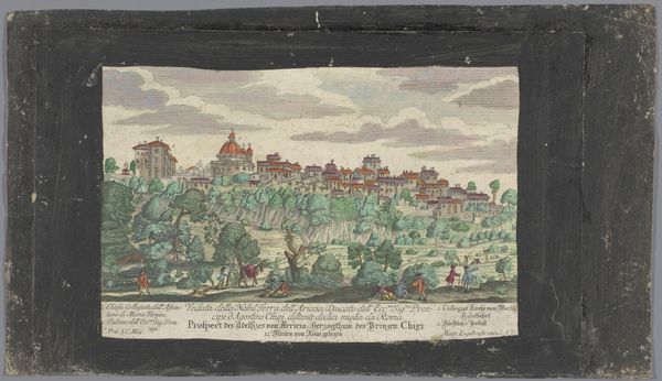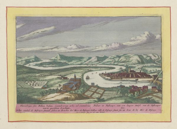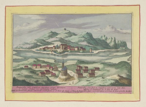 Curator: Let’s consider this detailed rendering of “Gezicht op de plaats Vélez-Málaga in Andalusië.” The watercolor and etching on paper provide a specific depiction of a place, but also speaks to broader issues. What strikes you about it? Editor: It’s… meticulous! So many tiny details. Given the listed materials, and the date (1694-1737), I imagine the production of these printed landscapes involved significant labor and resources. What exactly would the implications of that be for something like this piece? Curator: Precisely! Consider the social context of its making. Etching allowed for multiple reproductions, yet watercolor application likely varied. This suggests a process that was partially industrialized, making the image somewhat accessible, but also individualized through hand-colouring, retaining an element of artisanal value. Editor: So it's mass-produced, but with hand-finished touches. Almost like a compromise between art and craft. Is that unique to this era, or were similar approaches used elsewhere? Curator: These kinds of images fed a growing market for views, reflecting burgeoning mercantile interests and colonial expansion. The consumption of these prints tied into notions of status and the acquisition of knowledge about distant lands, all tied to very specific processes. Can you see how the image both documents and participates in a certain type of power? Editor: Yes, it makes me consider who exactly the intended consumer was and how it reflects both the access and biases of its time. I hadn't considered its purpose going in, to be honest. Curator: The act of creating, distributing, and owning this print was embedded in complex networks of labor, capital, and social relations. Examining those can deepen our appreciation. Editor: I will certainly be looking for evidence of those systems going forward! It adds a whole new dimension to understanding this work.