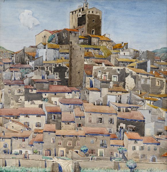 Editor: Okay, next up we have Hermann Lismann's "Soriano," created in 1924. It looks like watercolor and colored pencil on paper, and the first thing that strikes me is its wistful, almost dreamlike quality. What do you see in this piece, that perhaps I’m missing? Curator: Oh, that dreamlike quality definitely sings to me, too! For me, "Soriano" is Lismann's wistful meditation on time, memory, and the quiet grandeur of the Italian landscape. The hazy blues and soft browns, those muted greens – they almost feel like a half-remembered story. Do you get a sense of distance from it, almost as if the village is fading? Editor: Absolutely, there's a definite sense of distance, like viewing it through a historical lens, perhaps even rose-tinted? Curator: Precisely. The architectural elements—that fortress perched on the hilltop—speak to the layers of history embedded in this landscape, a silent witness to centuries passing. Notice, also, the delicate strokes in the foreground; the looseness contributes to this ethereal feel, contrasting with the solid, almost stubborn presence of the village itself. It’s as if Lismann is asking: how do we hold onto the past? Editor: That’s a really beautiful reading of it, especially the idea of trying to hold onto the past through art. Curator: It's like Lismann found a way to bottle a memory. We each bring our own experiences to it and can reflect upon this shared history in new ways. Editor: Well, I'll certainly be thinking about memories and wistfulness the next time I see a landscape painting. Thank you! Curator: My pleasure! It’s always exciting to rediscover familiar scenes.