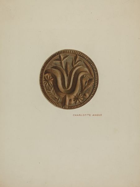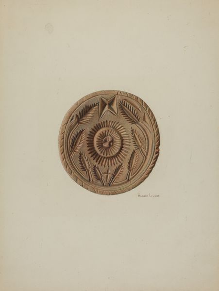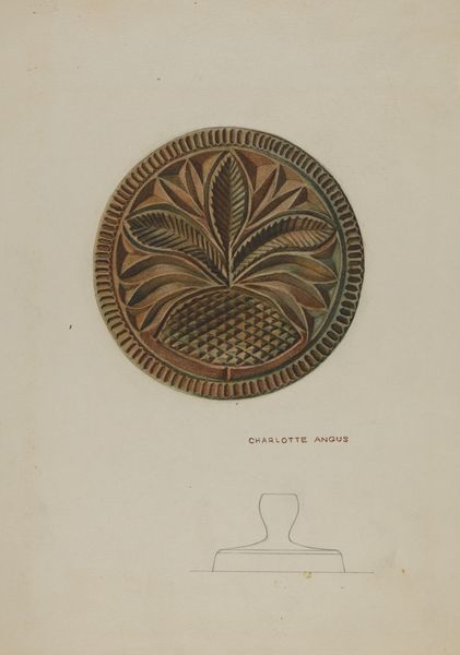 Curator: I’m struck by the precision of this wood carving, especially given its function. It appears incredibly tactile, almost like a stamp for butter, inviting touch. Editor: Exactly. Here we have a representation of a Pa. German Butter Mold, circa 1938, created by Charlotte Angus. What’s fascinating to consider is its intersection of utility and design. These weren't just functional objects; they were carriers of cultural identity, emblems of regional and ethnic pride within the domestic sphere. Curator: You can definitely see the domestic connection. The folk-art quality here brings with it that whole conversation of labor within the home and who gets recognition for it. To have something functional be so highly ornamented is lovely, if a little bit bittersweet given the artist. Editor: I think bittersweet is key, especially when considering the context of female labor at that time, and how folk-art offered space of ingenuity often dismissed by dominant structures in the Art world. The repetition of the central motif seems incredibly mindful and even empowering. Curator: In its geometric design and botanical reference, the form, carved from wood and meticulously illustrated, gives the butter what it’s molding a presence, suggesting a celebration of craft embedded in daily life, where these types of materials play an everyday function that reflects that same folk-art pride you mention. Editor: Absolutely. Looking closely at it, one might ask questions about artistic agency within the broader political landscape—How were materials and the access of production? To me it sparks discussion about women who were working within this system and claiming agency through domestic work and artistic practice. Curator: I agree entirely. And now, having considered the ways in which material, craft, and gender intertwine, it makes it much harder to simply see this as a pretty decorative design. It highlights the rich tapestry of historical and cultural significance woven into this humble object. Editor: Indeed. We're reminded that the objects we create and use hold profound narratives and reflections of how a society operates and represents itself through what it consumes.