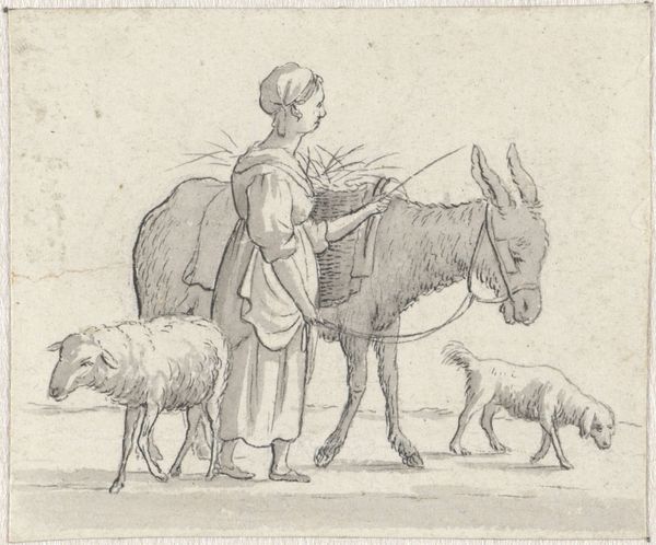 Editor: Here we have "Boer met twee paarden bij een drinkbak," or "Farmer with two horses at a watering place," created anonymously sometime between 1800 and 1900, using pencil on paper. It's a lovely, simple sketch. What strikes me is the clear depiction of everyday life; the horses drinking, the farmer casually on horseback. What do you see in it? Curator: I’m immediately drawn to the paper itself and the labor involved in its creation. In a pre-industrial context, both the paper and the pencil are products of significant handcrafting. Consider the social structures supporting that production. Who made the paper? What were their working conditions? Editor: That's an interesting perspective! I hadn't considered the socio-economic background behind the materials themselves. So, you are seeing the drawing less as a window into a scene, and more as a record of specific craft processes? Curator: Exactly. Think about the availability of art supplies at the time. This wasn't a mass-produced sketch; it involved careful sourcing of materials. Each pencil stroke is also a record of the artist's labor – the hand movements, the pressure applied, the very physical act of creating the image. Were preliminary sketches also required, impacting total labour input? Editor: That makes me see the drawing in a totally new light! It's not just the image represented, but the whole process of material production and artistic creation that gives it value. Curator: Indeed. The image depicts horses working, being cared for... while this pencil drawing is also work! These intertwined realities, the depicted labour and the artistic creation, encourage us to question what we define as “art” and what as simply labour. It is art when consumed and placed in a gallery. But the making is labor. Editor: This has really made me rethink my initial impression of the artwork! I'll definitely look at art with more material awareness now. Thank you! Curator: My pleasure! Considering materiality helps unlock layers of meaning within art often overlooked.