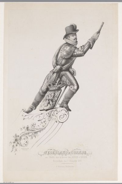 Herman Frederik Carel ten Kate created this print of Pieter Pieterszoon Hein using lithography. Ten Kate made this print in the 19th century, a time when national identity and historical narratives were being re-evaluated and re-imagined. The print depicts Hein, a celebrated Dutch naval officer known for his role in capturing a Spanish silver fleet in 1628. Hein's success was not just a military victory, but a significant blow to Spain and a boost for the Dutch Republic. Ten Kate's representation of Hein is powerful, emphasizing his leadership and strength. The inclusion of the spoils of war at his feet is a testament to Dutch maritime power and colonial ambitions. However, it's essential to acknowledge the complicated legacy of such figures. Hein's actions were part of a broader history of colonialism, trade, and the exploitation of resources and people. This image invites us to reflect on the narratives we construct around historical figures. How do we balance national pride with a critical understanding of history?
