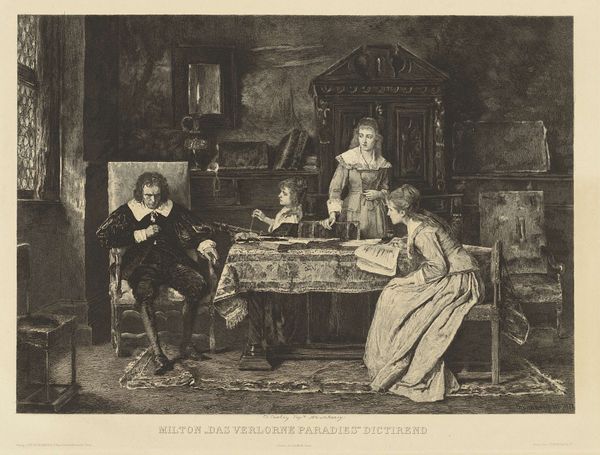 Mihály Munkácsy painted this representation of Milton dictating Paradise Lost to his daughters. Notice how the composition leads our eyes from left to right, from the dark solitude of Milton, towards the light that illuminates the women. The artist masterfully employs chiaroscuro—a contrast between light and shadow—to convey emotional depth. The somber tones engulfing Milton sharply contrast with the brighter hues surrounding his daughters, which creates a visual dichotomy between darkness and enlightenment. The stark lighting emphasises Milton's internal struggles while highlighting his daughters' diligence. The textured brushwork further enhances the painting's dramatic effect. Munkácsy's painterly technique adds a sense of vitality, drawing us into Milton's world and inviting reflection on themes of creation, adversity, and family relationships. Through its interplay of form and shadow, this work serves as a powerful meditation on loss and creativity.