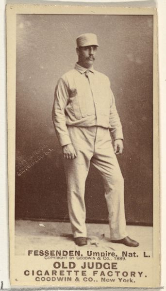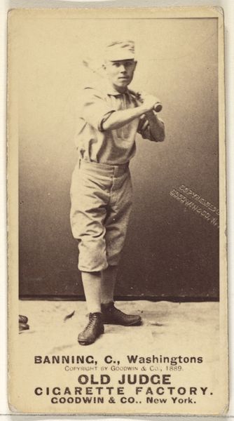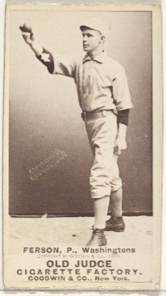 Editor: So, here we have a piece titled "George Washington Keefe, Pitcher, Washington Nationals," from 1889, part of the Old Judge series. It's a photo, a print actually, used for cigarette cards, and depicts a baseball player in uniform. It has this very… nostalgic feel to it, doesn't it? What jumps out at you? Curator: Well, it's interesting to consider what symbols resonate across time. Baseball, then as now, represented aspiration, leisure, a particularly American ideal of healthy competition. What does Keefe’s particular pose and dress evoke? He stands here formally presented in attire which resembles the popular suit worn for more elegant endeavors, juxtaposed with commoner sports attire. Does it denote hard work or play? Is he dignified or informal? These tensions contribute to the enduring symbolism in everyday life and activities. Editor: I hadn’t really thought about that, the suit implying wealth or privilege contrasted with the baseball uniform denoting more a blue-collar approach to making a living. So the image promotes both ideas equally, appealing to the whole social spectrum in the 1880's? Curator: Precisely. It highlights the cultural fluidity beginning at the time, blurring class lines through a shared love for sport and creating a very marketable symbolism of who and what can achieve this idealized American experience. Consider how advertising shapes identity and aspirations! Does it feel revolutionary even through this quiet sepia photograph? Editor: It does, actually. Thinking about it as a bridge between classes, and how sport contributed to that…that’s a really insightful reading. Thanks! Curator: My pleasure! These glimpses into the past through imagery constantly inform our present, don't they?