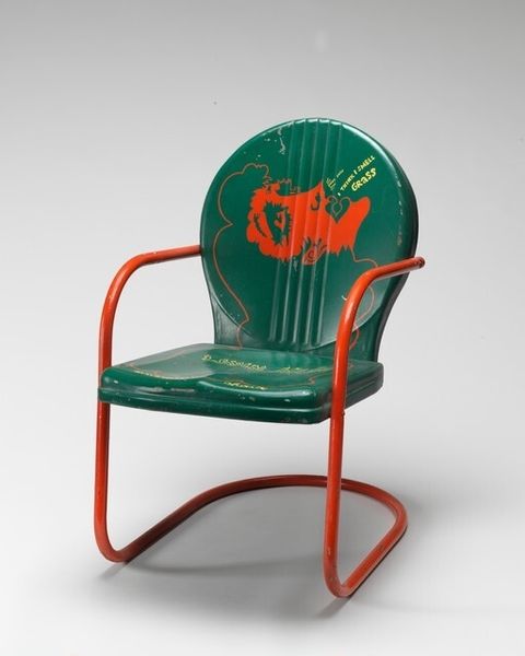 Jim Nutt’s “Untitled (Put Your Head Here)” is a painted metal chair that invites physical and psychological interaction. As a founding member of the Chicago Imagists, Nutt challenged conventional art norms, drawing inspiration from comic books, and self-taught art. This sculpture provokes consideration of the body. The phrase painted on the chair suggests an intimate, perhaps vulnerable, act. This is in tension with the design of the chair itself, which seems both functional and absurd. The combination of text and image prompts questions about expectations of comfort and support, while subtly unsettling the viewer. Nutt's work often integrates humor with unsettling imagery, reflecting his interest in the complexities of human psychology. “Untitled (Put Your Head Here)” captures this blend, inviting reflection on what it means to be supported, physically and emotionally, and how such support can be both comforting and precarious.