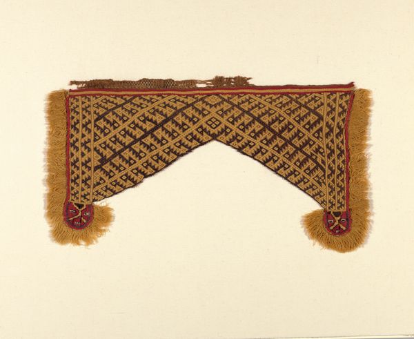 Curator: This textile fragment, attributed to the Wari culture, possibly dating back to 800 to 1100, is currently housed here at The Art Institute of Chicago. Editor: Well, my first thought is: wow, look at that ochre fringe! It feels almost playfully theatrical against the weight of that brooding dark-brown fabric above. But I’m mostly drawn to how something so visually busy somehow manages to feel very restful. Curator: It's a compelling tension, isn’t it? We have this solid block of what seems like intentionally austere material paired with the lively geometric patterning in the weaving below, punctuated by that long, sweeping fringe. As a piece, it offers a window into the visual strategies used to project imperial power in the Andes. Textiles held immense cultural significance, didn't they? Editor: Absolutely. Imagine the artist's hands, meticulously working each thread! And that restricted color palette—dark browns, reds, creams, subtle blues— creates such a sophisticated harmony! I also love the way those geometric figures seem almost like glyphs in a lost language; I imagine they’re figurative but have become something abstract. Curator: Exactly. The geometric shapes and figures might represent deities, ancestors, or important narratives. The Wari state used such works to consolidate authority; gifting them to local leaders in an effort to communicate with potential vassals to cement allegiances. The fragment would have circulated as a crucial element of elite display. Editor: It's powerful how something created to project strength can whisper so much to us now across time. When you look closer, those rigidly controlled forms hint at so much: trade, craft traditions, symbolic power structures...It becomes almost like an entire social world compacted into the weave. I see a meditation. Curator: It truly becomes a relic with far-reaching effects and consequences when observed in its appropriate setting. A society’s politics made visible through warp and weft. Editor: Absolutely, textiles weren't "just" art. In these societies, their practical, historical and social significance elevate textiles to so much more. It makes me wonder what stories this particular Fragment holds beyond what we immediately perceive. Curator: It is that depth of intertwined meaning which helps preserve these pieces through the ages, giving them lasting importance in a contemporary context. Editor: A beautiful, yet imposing puzzle—one which reveals more of its beauty the closer you look.